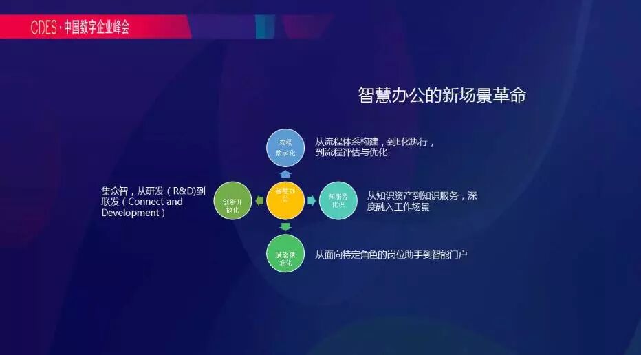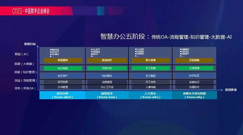 在“中国数字企业峰会”上,蓝凌副总裁夏敬华博士在《从KM到AI:四大场景助力智慧企业构建》的演讲中,详细解读了智慧办公的4大管理要素、5大阶段、4大场景革命。